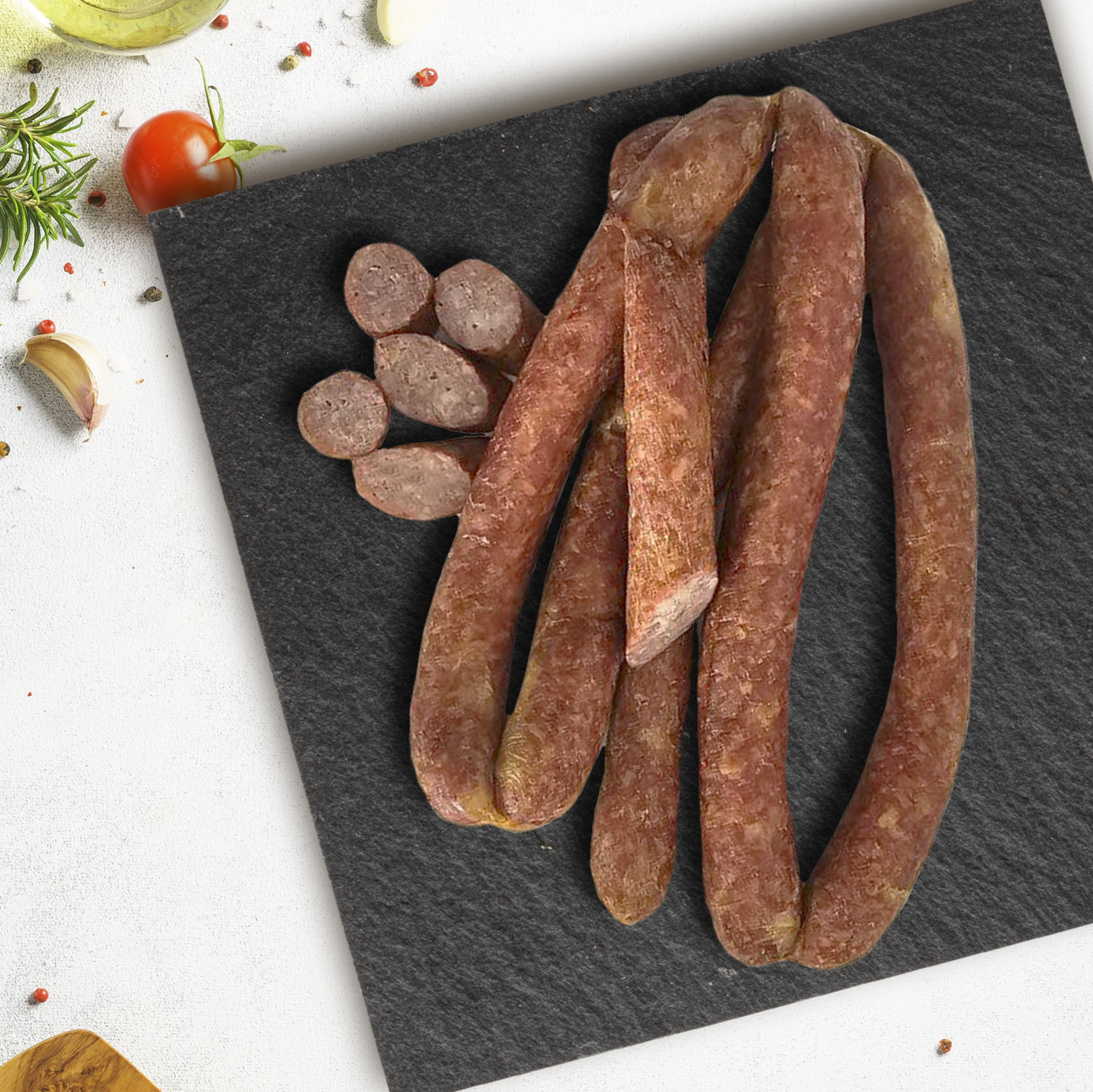 Благодаря высококачественному мясу и хорошо подобранным пряностям продукт имеет приятный аромат и великолепный вкус. Сочные, натуральные фермерские колбаски!