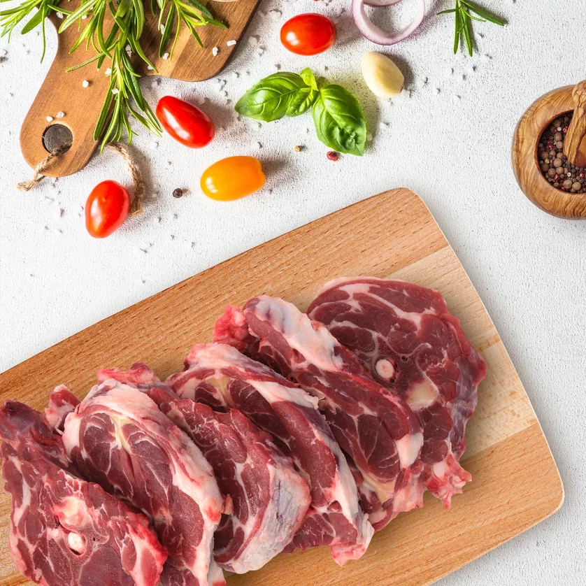 Шея ягненка — это ароматный и нежный кусок мяса, полученный из области шеи ягненка. Его обычно используют в рагу, тушеных блюдах и рецептах медленного приготовления.